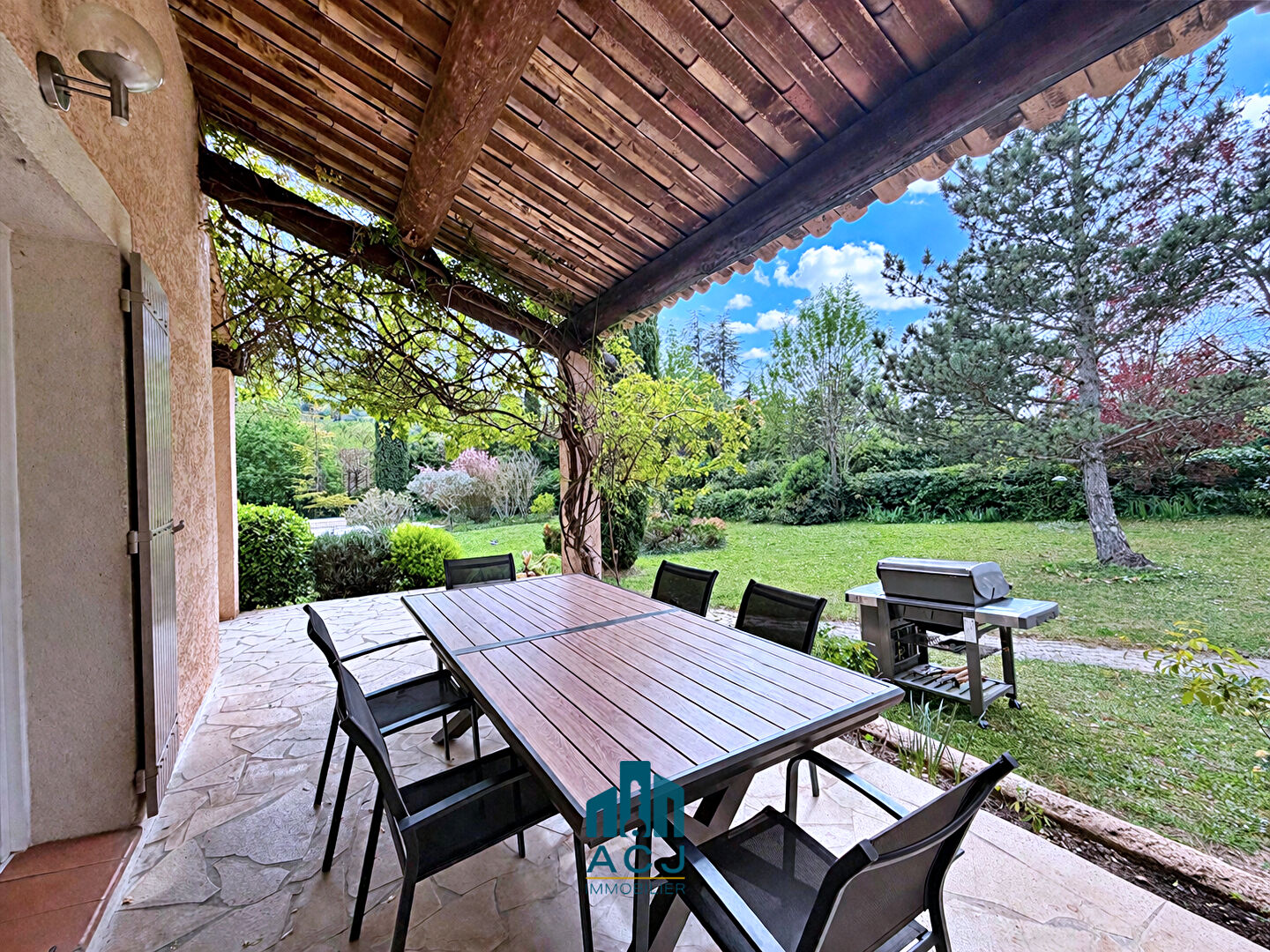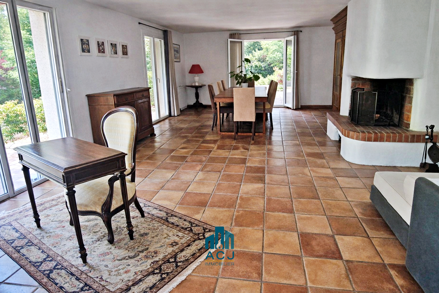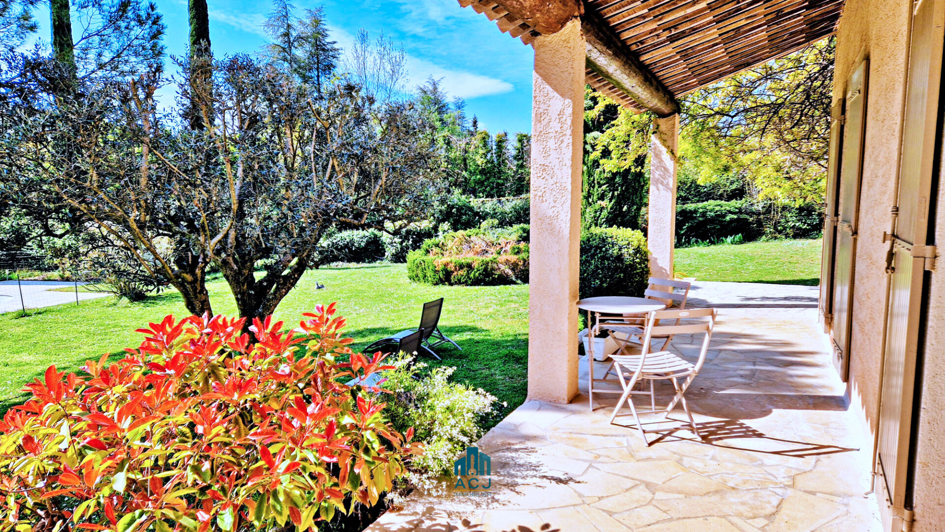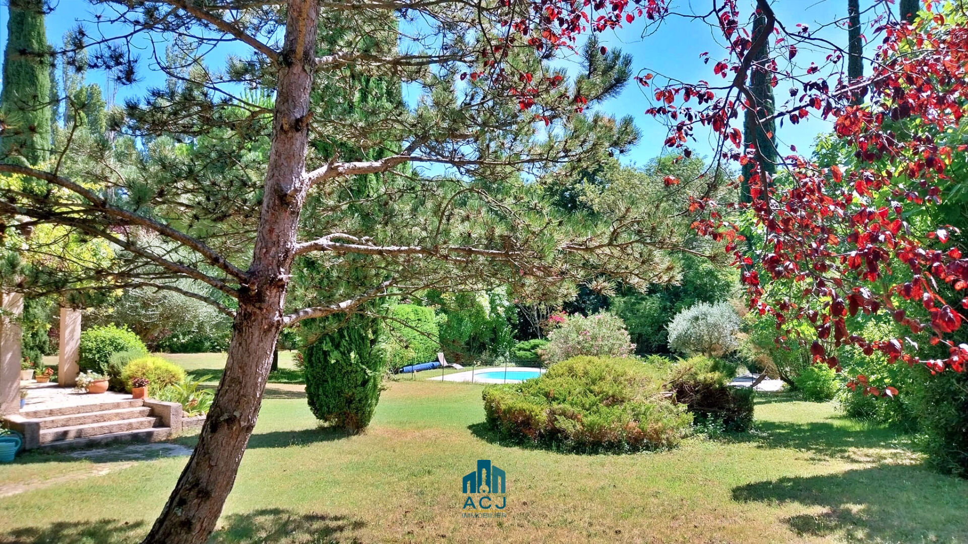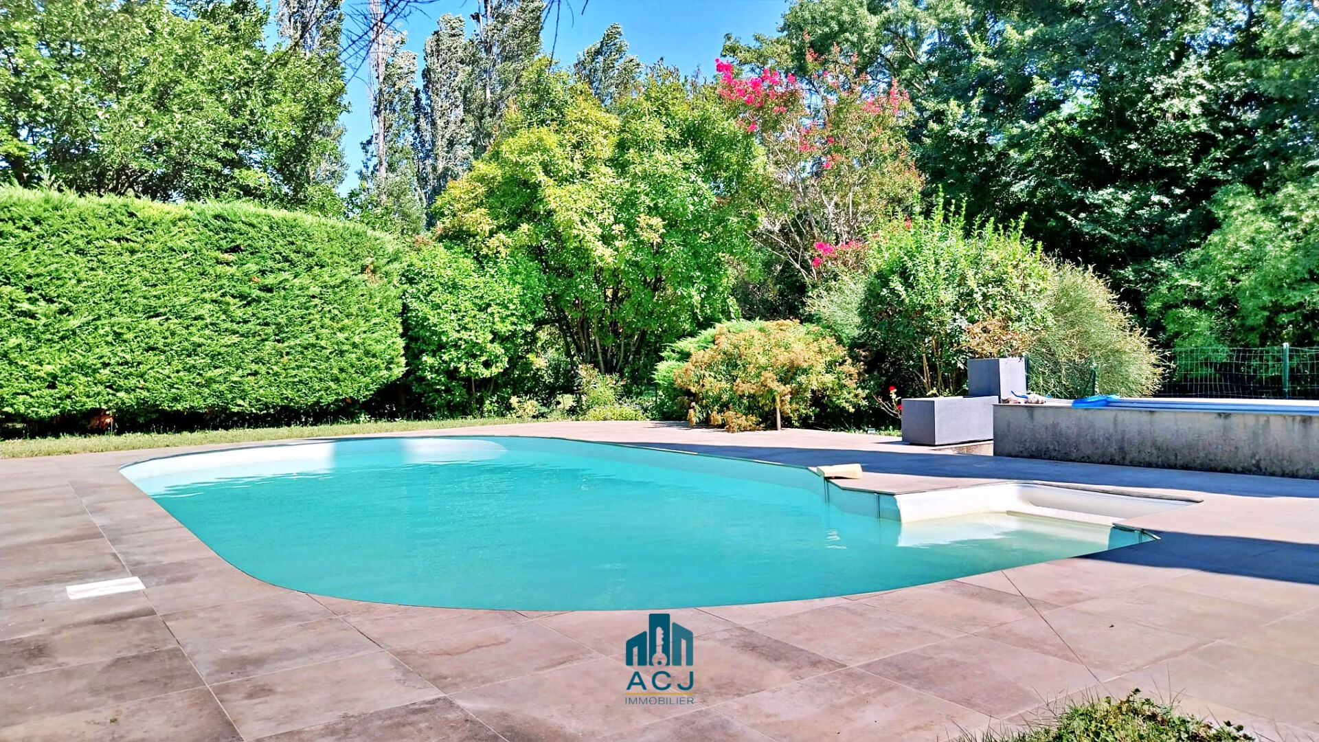 Un terrain paysager de plus de 4 000 m², sans vis-à-vis, avec vue sur les collines environnantes. La piscine devient le point de rendez-vous des belles journées.